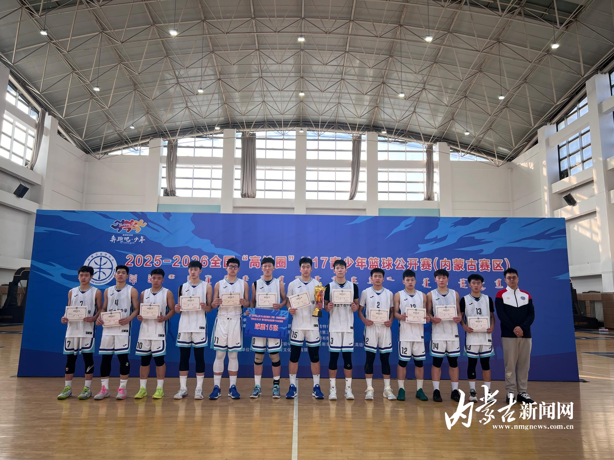 本网讯(草原云·内蒙古新闻网首席记者 牛天甲) 1月22日,2025~2026全国“高铁圈”U17青少年篮球公开赛(内蒙古赛区)落下帷幕,最终包头市第三十三中学以全胜战绩斩获本次赛事冠军。