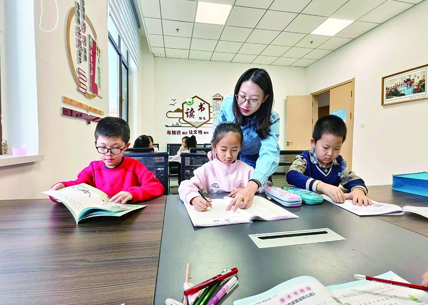 志愿者辅导孩子们写作业 刘佳鑫 摄