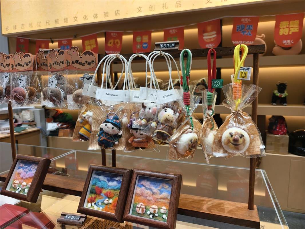 为推动产业升级、增强可持续发展动力,“巧娘工作室”主动求变,引入3D模具生产技术提升批量生产效率,深化文旅体农商融合,一方面持续开发系列新品,另一方面加强品牌培育与市场推广,联动景区、民宿打造特色消费场景。“只有融入本土文化,手工艺品才能有灵魂、有市场。”基于这一理念,向阳街道重点引导学员将本地文化元素、旅游地标(如红山、玉龙、对夹)融入羊毛毡创作,开发出一系列具有鲜明地方特色的文旅产品。从马年主题挂件、玉龙造型摆件,到复刻赤峰对夹的创意饰品,这些充满地域风情的“网红”文创产品,不仅成功入驻赤峰市博物馆、辽代历史文化博物馆的文创展区及各大景区商店,更代表“赤峰好物”亮相北京各类展会,凭借独特的地域魅力和精湛工艺赢得广泛好评,部分订单远销海外,成为宣传赤峰旅游形象、传播红山文化的“亮丽名片”。