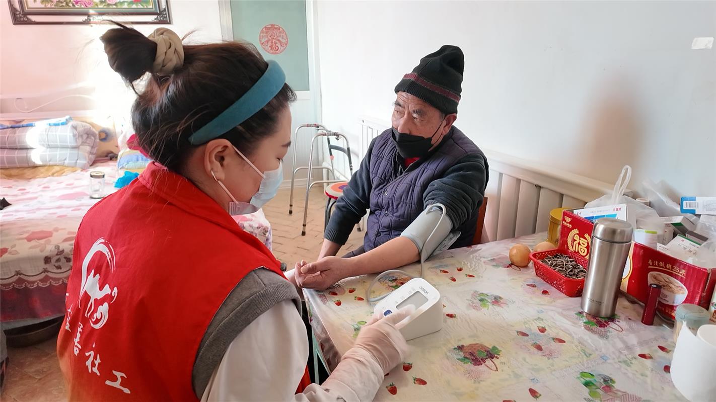 居家养老服务工作人员为老人量血压