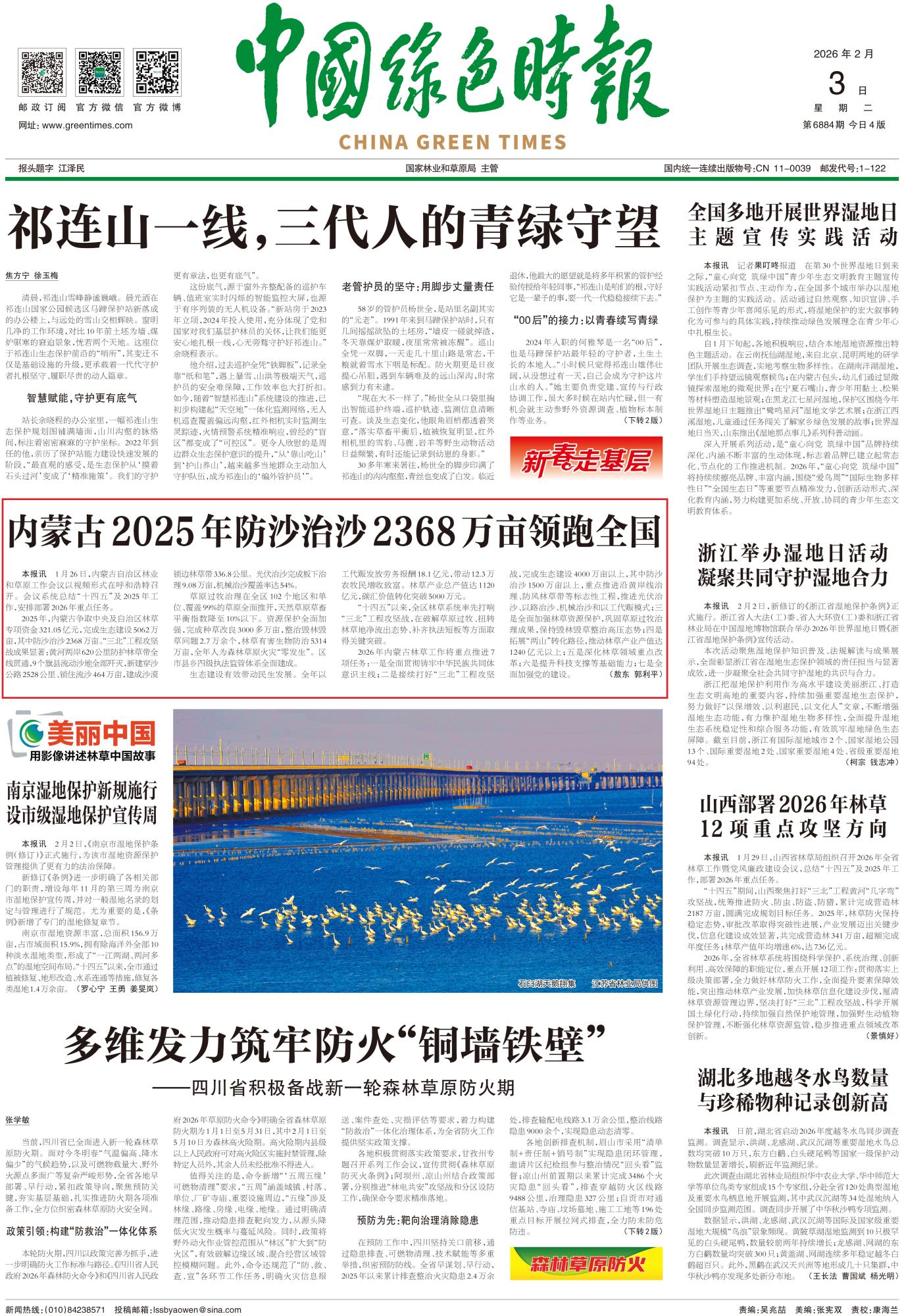2026年2月3日,《中国绿色时报》第1版刊发题为《内蒙古2025年防沙治沙2368万亩领跑全国》的文章,报道了2025年,内蒙古争取中央及自治区林草专项资金321.05亿元,完成生态建设5062万亩,其中防沙治沙2368万亩。“三北”工程攻坚战成果显著:黄河两岸620公里防护林草带全线贯通,9个旗县流动沙地全部歼灭,新建穿沙公路2528公里、锁住流沙464万亩,建成沙漠锁边林草带336.8公里。