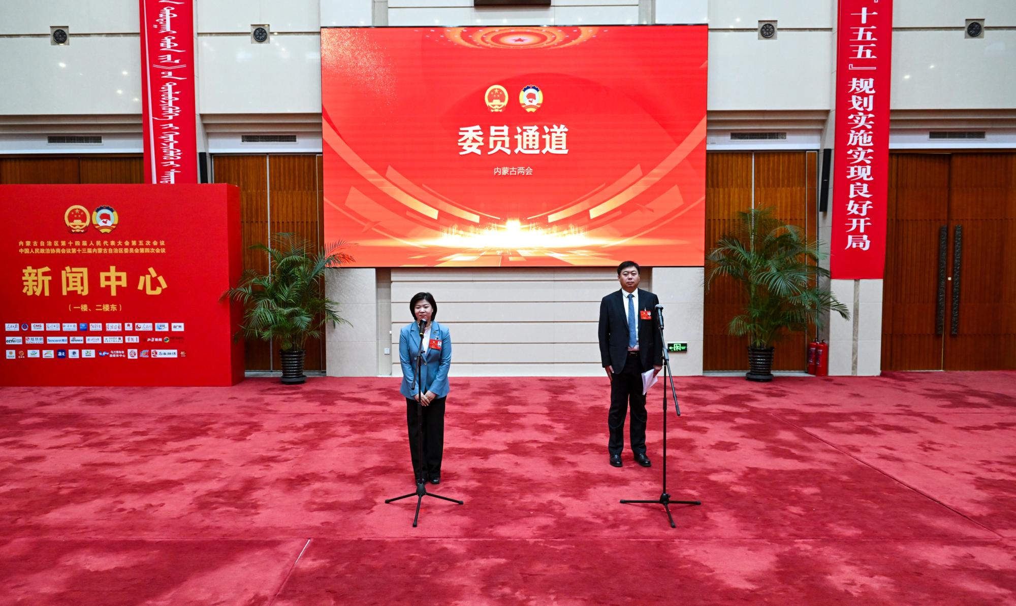 自治区政协委员蒋利(右)、自治区政协委员黄双燕在首场“委员通道”现场。 草原云记者 王磊 摄