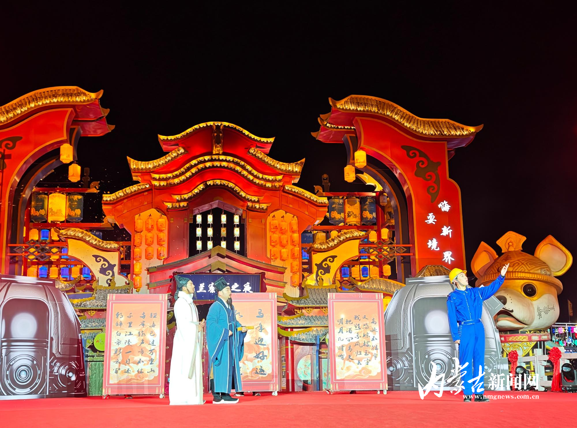 开街仪式上演跨时空文化对话。雪花轻扬,灯光流转间,李白、苏轼身着古装款款走来,诗仙诵“朝辞白帝彩云间”细数盛唐速度,诗神吟“明月几时有”畅想月宫之游。大数据员工登台应答,用高铁飞驰、神舟探月、AI赋能的现代图景,与两位文人展开趣味互动,让游客沉浸式感受传统文化与科技发展共振的魅力。