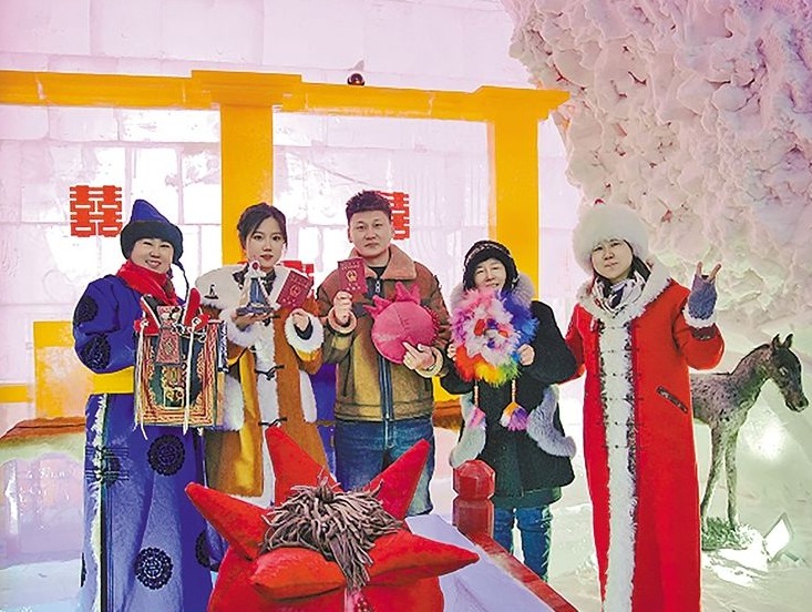 新人在呼伦贝尔市冰雪民俗旅游基地打卡,感受当地冰雪民俗文化。