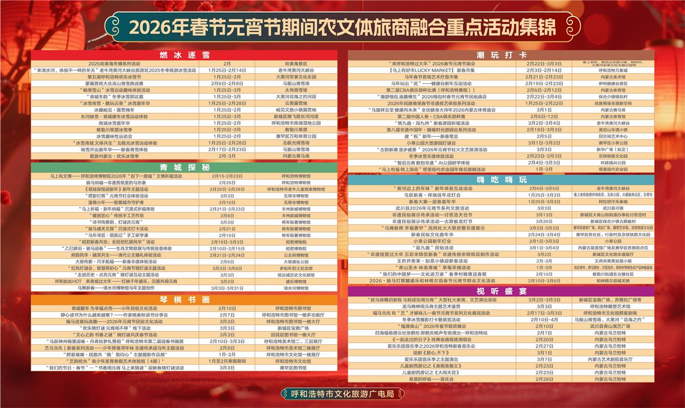 来呼和浩特过大年吧,即日起至3月3日,呼和浩特推出了融合冰雪、民俗、文化、消费等多元元素的新春文旅活动。