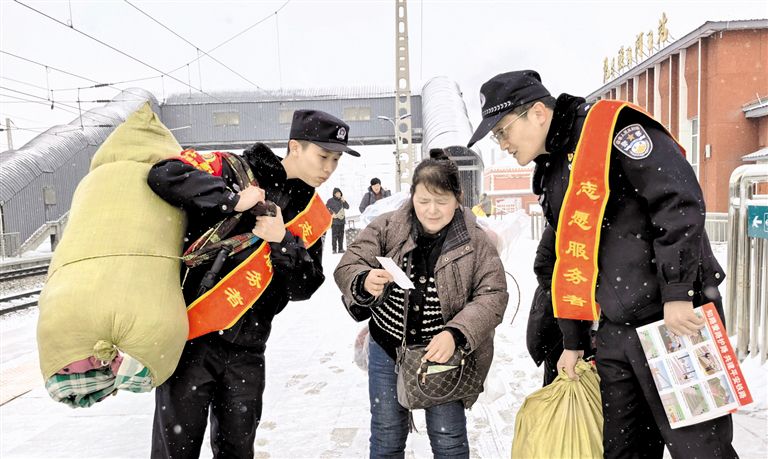 2月21日,呼伦贝尔免渡河站派出所民警坚守春运一线,主动为旅客搬运行李,用暖心行动守护旅客平安出行。呼伦贝尔铁路部门紧扣平安、有序、温馨目标,积极应对严寒风雪天气,全力保障旅客出行顺畅。草原云·内蒙古新闻网记者 李新军 摄