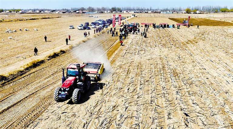 4月8日,在巴彦淖尔国家农高区智慧农业示范园区,一台集旋耕、起垄、镇压、覆膜、滴灌、播种于一体的新式农机现场演示作业,展现了当地推动农机装备向高端智能升级的成果,为春耕生产提供了科技支撑。草原云·内蒙古新闻网记者 薄金凤 摄