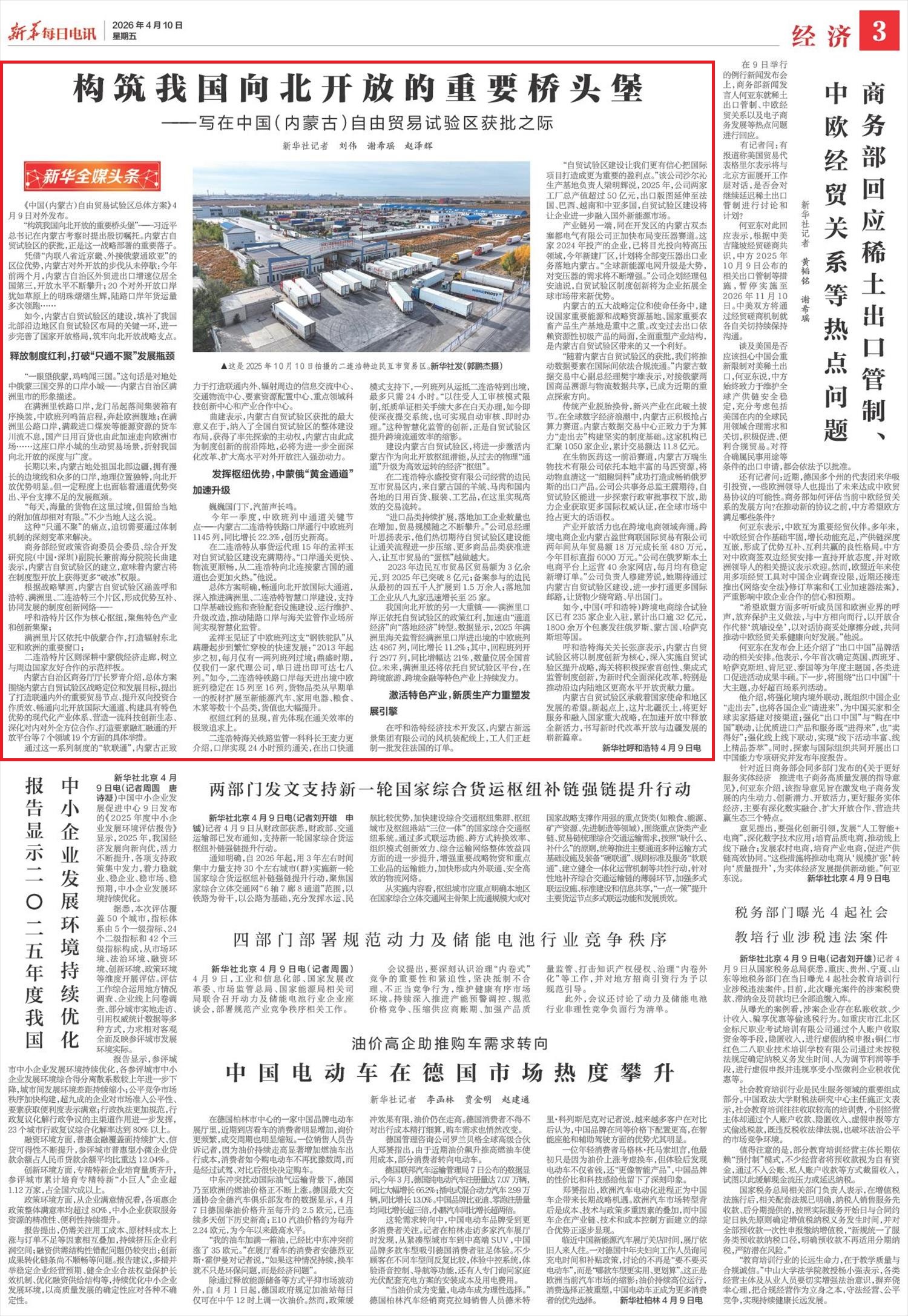 2026年4月10日,《新华每日电讯》第3版刊发题为《构筑我国向北开放的重要桥头堡——写在中国(内蒙古)自由贸易试验区获批之际》的文章,报道了《中国(内蒙古)自由贸易试验区总体方案》4月9日对外发布。内蒙古自贸试验区的建设,填补了我国北部沿边地区自贸试验区布局的关键一环,进一步完善了国家开放格局,筑牢向北开放战略支点。