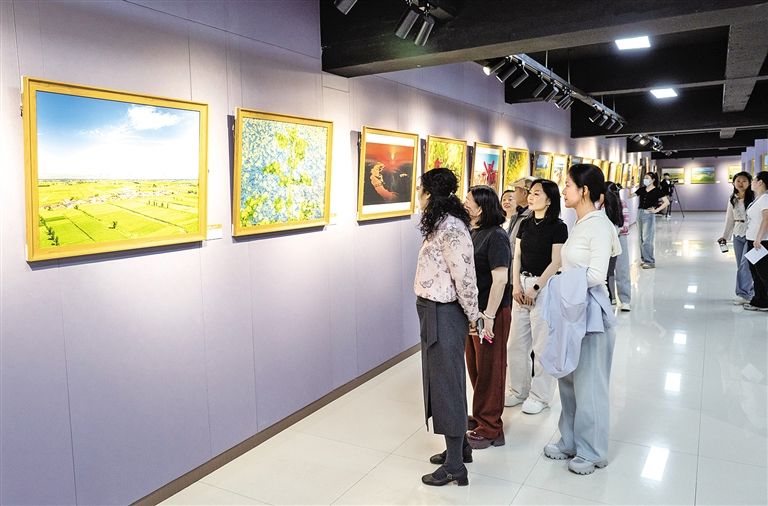 4月12日,市民在巴彦淖尔市河套文艺展厅欣赏参展作品。“天赋河套 美丽葵乡”第六届向日葵摄影展展出来自全国的95幅(组)摄影佳作,涵盖田间劳作场景、自然人文融合、产业发展纪实三大主题。巴彦淖尔市是全国最大的食用向日葵种植基地,常年稳定种植向日葵400余万亩,占自治区50%以上,占全国25%以上,葵花籽成为带动当地农牧民增收的重要产业。草原云·内蒙古新闻网记者 薛来 摄