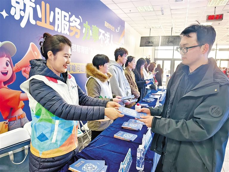 工作人员为求职毕业生发放就业创业政策宣传手册。