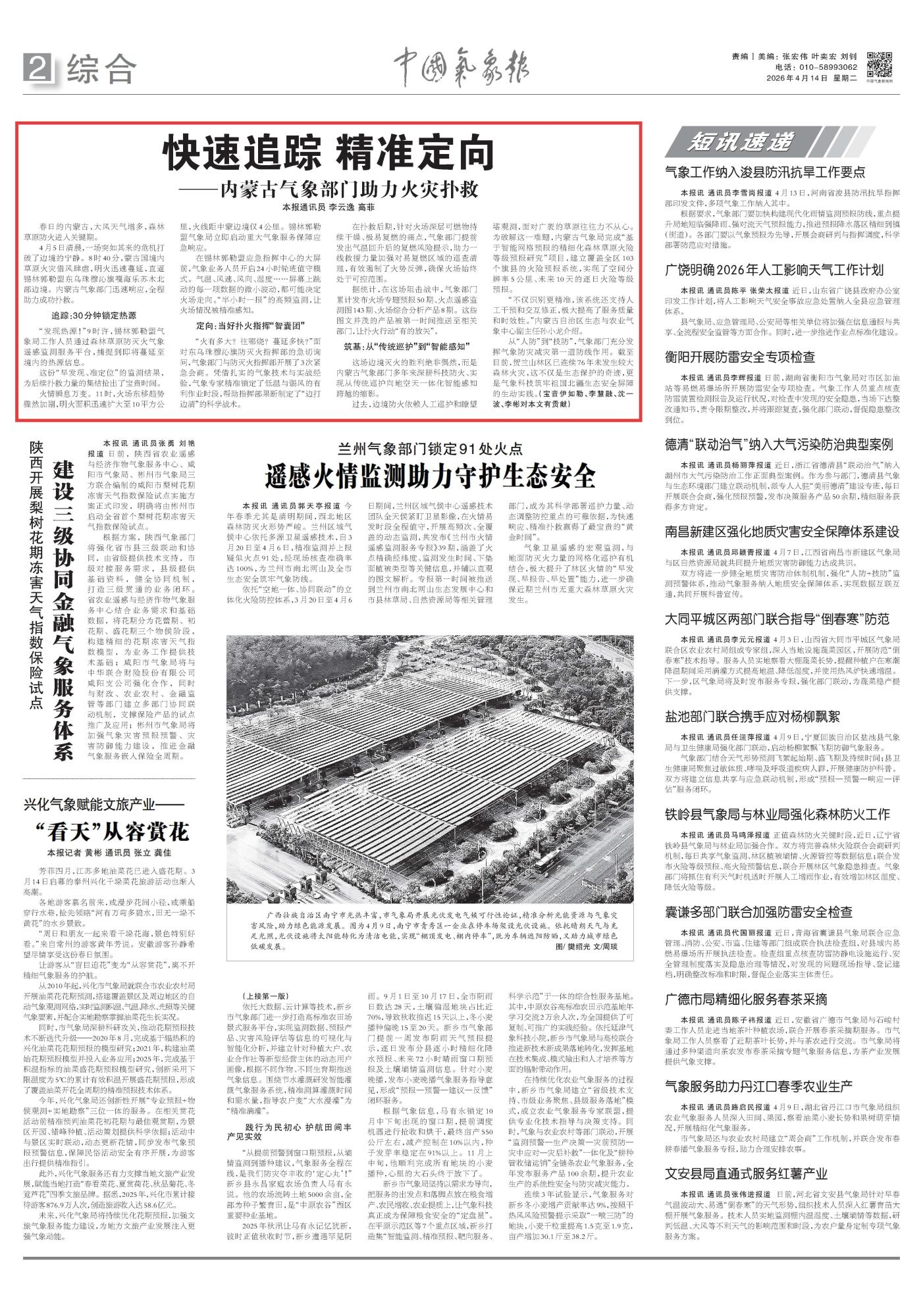 2026年4月14日,《中国气象报》第2版刊发题为《快速追踪精准定向——内蒙古气象部门助力火灾扑救》的文章,报道了内蒙古气象部门运用遥感监测平台,快速锁定蒙古国入境草原火情,精准提供气象数据,助力科学扑救,筑牢北疆生态安全屏障。