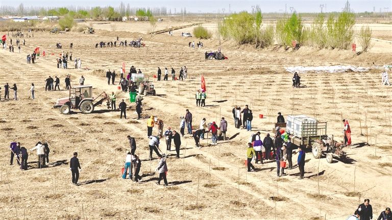 4月14日,巴彦淖尔市启动全民义务植树大会战,2000余名干部群众当日植树4.2万株。“十四五”以来,该市累计完成林草建设1605万亩,“十五五”期间计划再完成1000万亩以上,持续厚植绿色生态底色。草原云·内蒙古新闻网记者 薄金凤 摄