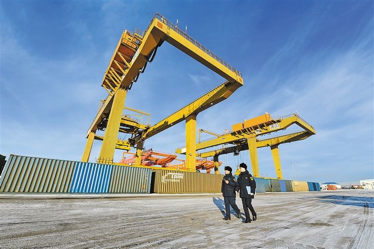 满洲里海关所属满洲里车站海关关员在满洲里新集装箱场对中欧班列集装箱进行巡检。满萱 摄
