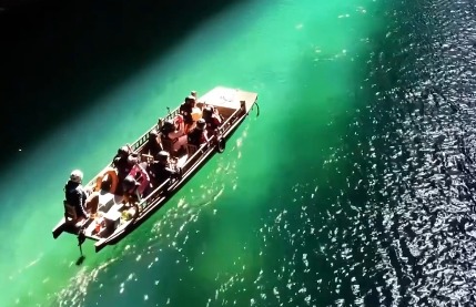 阳光穿透水面,投射出粼粼波光造就“船行空中”的奇幻景象!