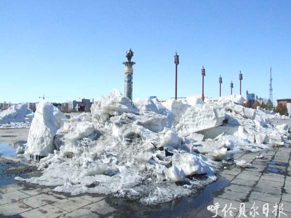 在海区成吉思汗广场上,记者也看到,大量雪雕被推倒或倒塌后,散乱地堆在广场上,与周围的环境极不协调。一位路过的市民说,雪雕作为景观,以前挺漂亮的,也给百姓带来了视觉上的享受,但是现在融化之后,堆在广场上不仅不美观,还影响了市容。