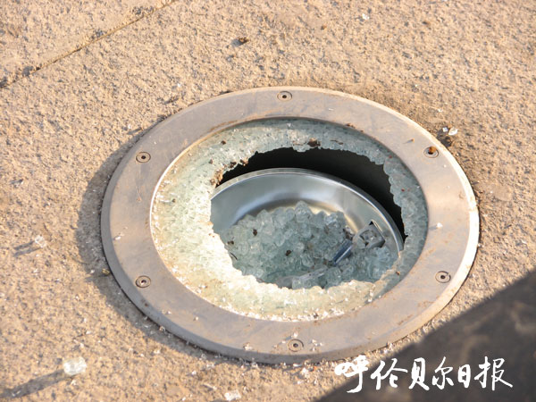 记者看到这座雕饰物基座四周总计4盏埋地灯全被砸毁,环顾小广场未见一件“凶器”。当记者将此事告知随后来到这里植树的海区园林处员工时,对方既惊讶气愤又惋惜:一盏灯可是好几百块呢。