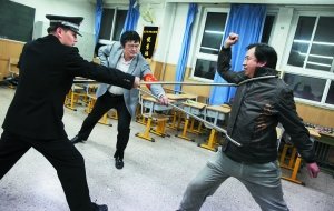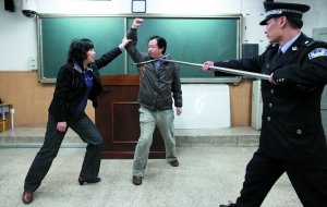 4月29日,北京三中教室,两位老师与民警一起演示用警用钢叉对付闯进学校袭击学生的歹徒。当日,西城区为全区所有中小学和幼儿园以及校外机构配备了近200个警用钢叉,警用钢叉将交给学校门卫,成为学校防范犯罪侵害的新武器。本报记者韩萌摄