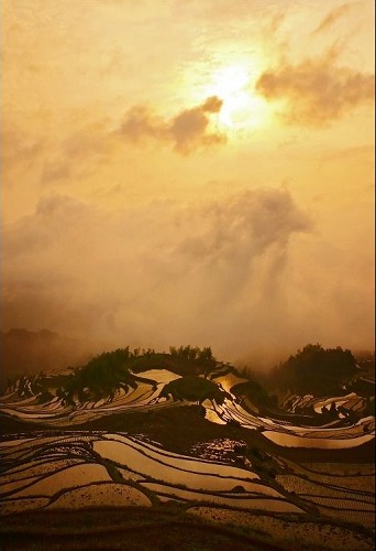 天空刚刚泛白时,云和梯田的山谷中全都是翻腾的白雾,仿佛大海里的浪涛,一浪接一浪,一浪叠一浪,一浪推一浪,反反复复,来回汹涌。除了近处的几丘梯田,远处的几座山峰,什么也看不到,只有翻腾的白雾!红日从东边山凹探出脑门时,白雾便慢慢散去,由浓及淡,由近及远,山谷中的梯田好像被谁悄悄拉去盖在身上的丝巾,一览无余展示在人们的眼前。阳光下的梯田,层层叠叠,从山脚一直叠到山顶,一层层裹在大山的伟岸之躯。