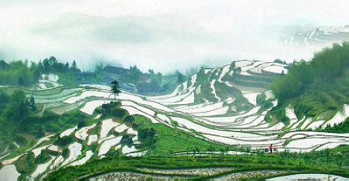 山有多高,水就有多高。千百年来,云和畲汉两族人民根据不同的地形、土质修堤筑埂,把终年不断的山泉引进梯田。高山水田,因水气循环圈异常活跃,一年四季变幻出万千气象:春飘条条银带,夏滚道道绿波,秋叠座座金塔,冬砌块块白玉……一幅幅天然画卷因四季变化而变幻,这震撼人心的人间奇观,便是云与水携手创造的绝世之作。