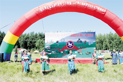 近日,扎鲁特旗举办了以旅游产品设计、研发为主题的产品设计大赛暨旅游文化艺术节。此次大赛,参加评选和展出的作品包括民族服饰、旅游食品等10多个品种。图为牧民们在展示民族服饰。(刘浩淼 摄)