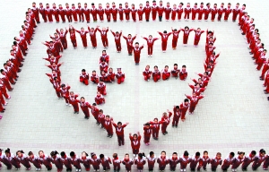 昨日,呼和浩特市新城区丁香路小学的学生们摆出心形图案,迎接国庆节的到来。当日,该校举办“迎国庆 秋季趣味活动日”。在活动中,学生们不仅参加了跳绳、趣味接力跑等比赛,还摆出一个大大的心形图案,表达了对共和国的祝福之情。摄影/本报记者  孟和朝鲁