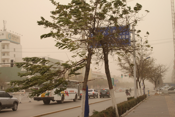 实际上,昨天天刚亮,天空就阴沉沉的,而且还刮着风,预示着当天不会是一个好天气。随着时间推移,风越刮越大,并出现了扬沙,阴沉的天空又变成了灰蒙蒙一片。午后时分,沙尘天气丝毫没有退却的意思,反而变本加厉,强度越来越大。当日15时开始,天空中沙尘弥漫,整座城市都被笼罩在黄沙中。记者在街头看到,不少行人都围起纱巾或戴上口罩,树叶被刮得满街跑,部分广告牌被刮烂……