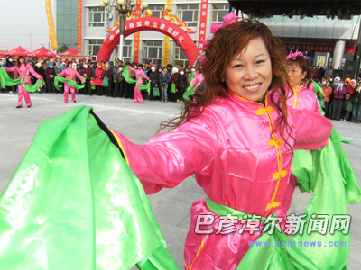 丰收的农民满怀喜悦的心情扭起了大秧歌,县乌兰牧骑的演员倾情献艺。磴口县武装部、人口和计划生育局、民政局、交警队及磴口移动分公司等十几家单位为农民提供各种服务,农机部门展销各种农业机械。此次文化三下乡活动举办两天,其间举行农民运动会,开展篮球、排球、乒乓球、自行车等项目的比赛。(记者 潘生富)