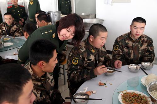 12月11日,新兵连长(右三)在与新兵们交流食堂的饭菜情况。当日,内蒙古公安边防总队迎来首批来自陕西和内蒙古等地的新兵。未来3个月中,他们将在教导大队接受严格的军事训练。新华社记者邹俭朴摄