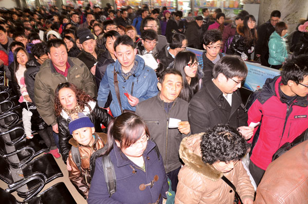 8日,呼和浩特火车站候车大厅等待检票的旅客排起了长队。当日是2012年春运首日,据介绍,呼和浩特火车站当日发送旅客2.1万人,整个春运预计发送旅客72万人,同比增长11.2%。 (摄影/记者王磊)