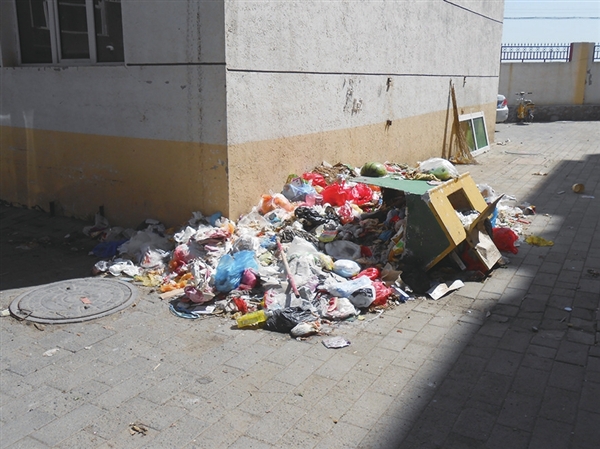 垃圾桶遭到破坏,垃圾成堆。
