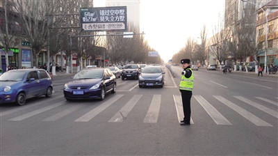 在锡林郭勒南路与大学街交叉口,记者看到玉泉区交管大队的交警已经站在现场开始指挥交通,一名交警站在十字路口中间,两名交警站在十字路口东侧。这里的十字路口是大学街单行线的西起点,从这里开始,社会车辆只能沿着大学街向东行驶。