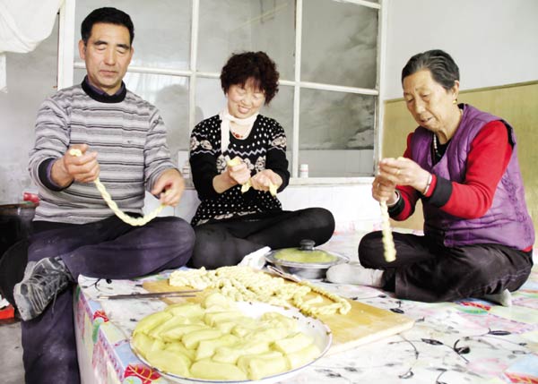 2月8日,武川县壕赖山村村民尚和平(左)一家正在制作面食糕点。春节,他家茶几上将摆满各种传统面食糕点,迎接八方来客。记者 王晓博 摄