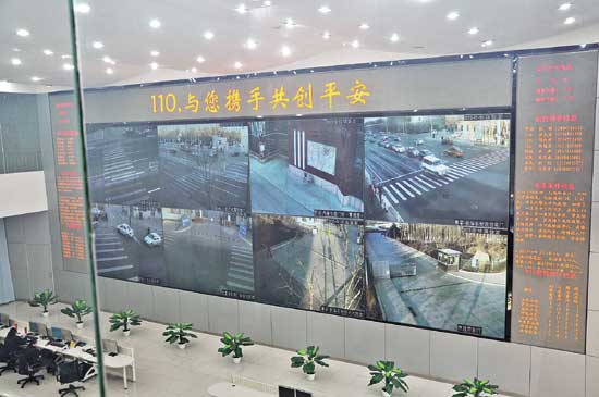 呼市公安局110指挥中心平台24小时监测。记者钱曙光摄