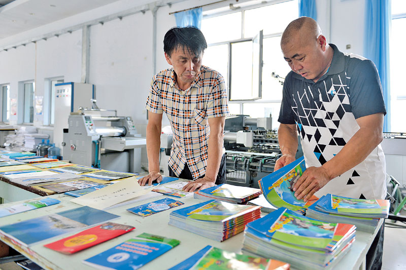 7月23日,阿巴嘎旗悟翰蒙古文印刷厂内,工人们正在打包整理蒙古文印刷品。为满足广大蒙古族读者群的需求,阿巴嘎旗整合锡林郭勒盟彩印行业的有效资源,挖掘培养优秀翻译、创作人才,项目一期工程计划投资500万元,大力扶持以蒙古文翻译、印制为主营业务的阿巴嘎旗悟翰蒙古文印刷产业园提档升级,努力打造锡林郭勒盟以及全区蒙古文书籍翻译、出版、印刷产业基地。自2014年9月试生产至今,该项目印刷14套图书7万册、画册1.5万本。记者金泉摄