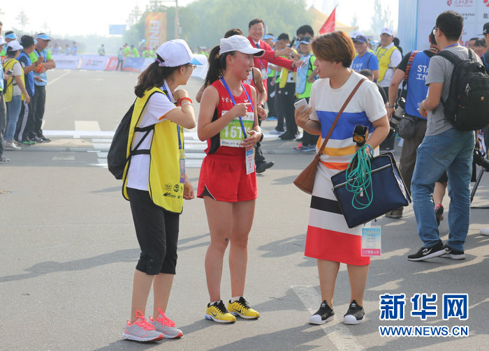 来自内蒙古巴彦淖尔的参赛选手李科以获得半程马拉松女子组第一名,用时1小时17分(曹桢摄)
