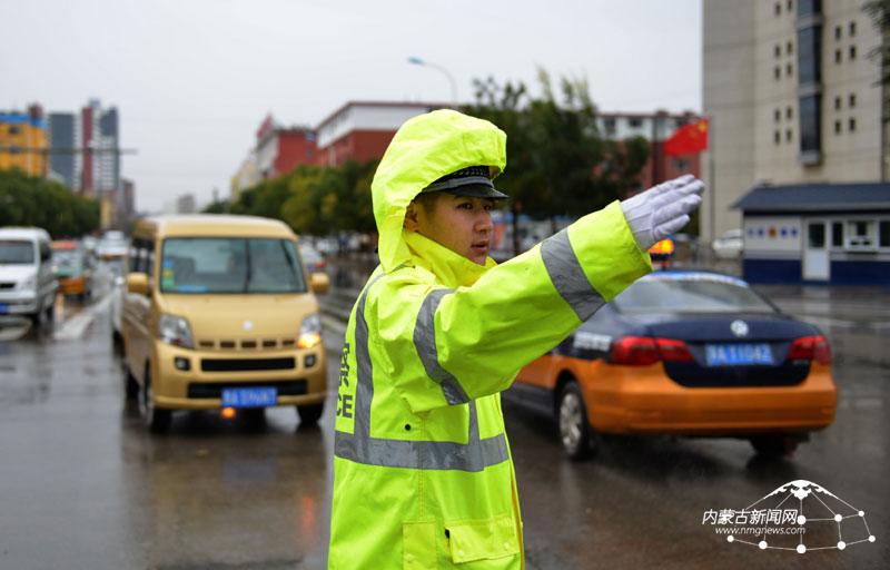 呼和浩特市玉泉交警二中队的交警在雨中执勤