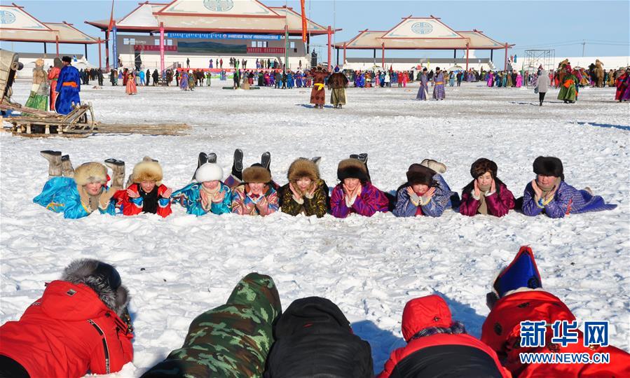 12月17日,游客在雪地拍照留念。当日,内蒙古呼伦贝尔市新巴尔虎左旗“银色巴尔虎”冬季旅游系列活动启幕,包括赛马、赛骆驼、射箭、博克及冰雪项目等在内的系列活动陆续展开。新华社发(韩冷摄)