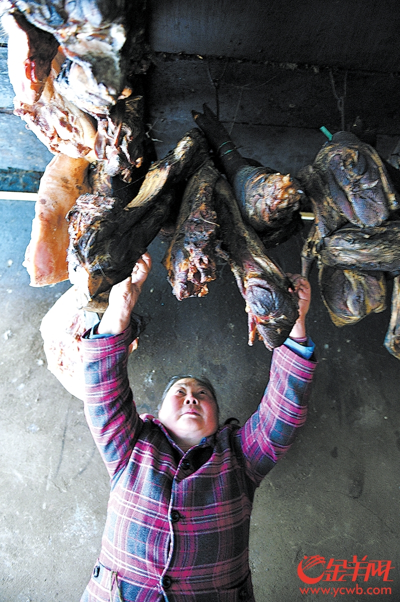 乡村小院里,一名农妇正在熏制腊肉。腊肉的做法也相当考究,一定要在寒冬腊月做出来的才会又香又有嚼劲