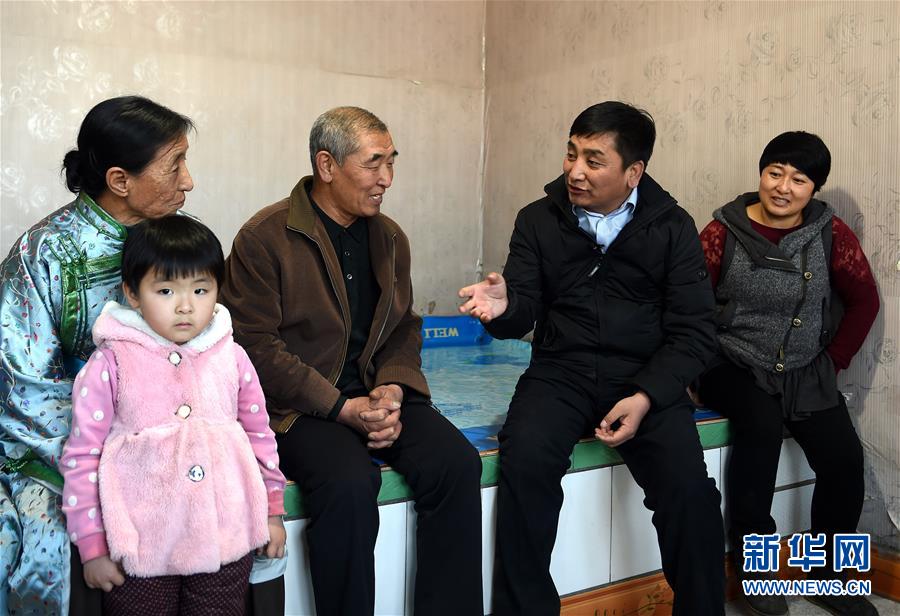 全国人大代表吴云波是内蒙古自治区扎鲁特旗巴彦塔拉苏木东萨拉嘎查党支部书记。2013年起,吴云波以现金、耕地和牛入股的方式成立合作社,吸收农牧民加入,并探索出了一条“党支部+合作社+贫困户”的扶贫模式,不断增加农牧民收入。目前合作社总资产达到3400万元,2017年净利润360万元,带动37户贫困户稳定脱贫。吴云波希望,通过扩大肉牛养殖规模,发展壮大农牧区合作社等方式,带动全体农牧民,尤其是贫困农牧民普遍增收致富,共享新时代的发展成果。这是吴云波(右二)在内蒙古自治区扎鲁特旗巴彦塔拉苏木东萨拉嘎查村民王金财(右三)家了解情况(2月25日摄)。新华社记者任军川摄