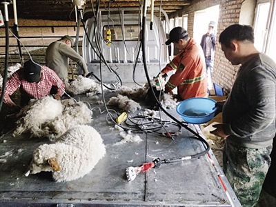 牧民运用新型器械提高剪羊毛效率
