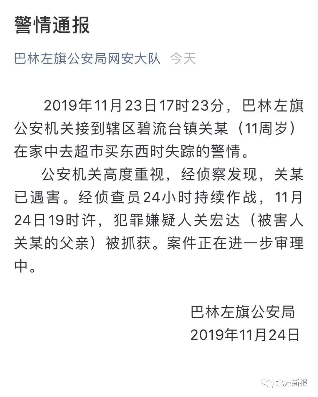 据内蒙古赤峰市巴林左旗公安局官方微信消息,2019年11月23日17时23分,巴林左旗公安机关接到辖区碧流台镇关某(11周岁)在家中去超市买东西时失踪的警情。公安机关侦察发现,关某已遇害。