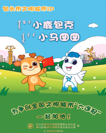 据了解,橙色小鹿“包克”寓意着包头的精神文明建设,蓝色小马“图图”寓意着包头的物质文明建设。2020年中央文明办将开展第六届全国文明城市评选,我市率先在全国打造、推介文明城市IP形象,通过专家论证、试点推动,将两个体现城市特色的IP形象——小鹿“包克”和小马“图图”融入到创城工作,下转04