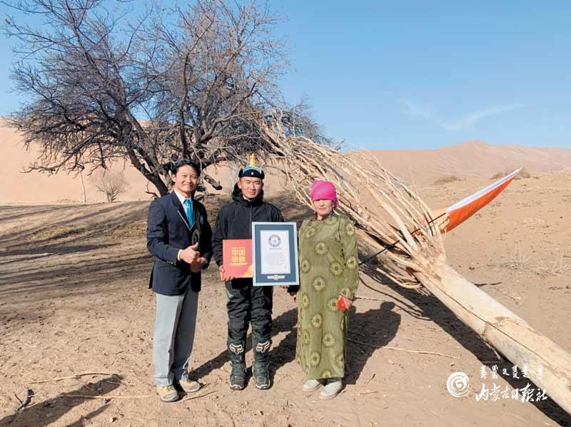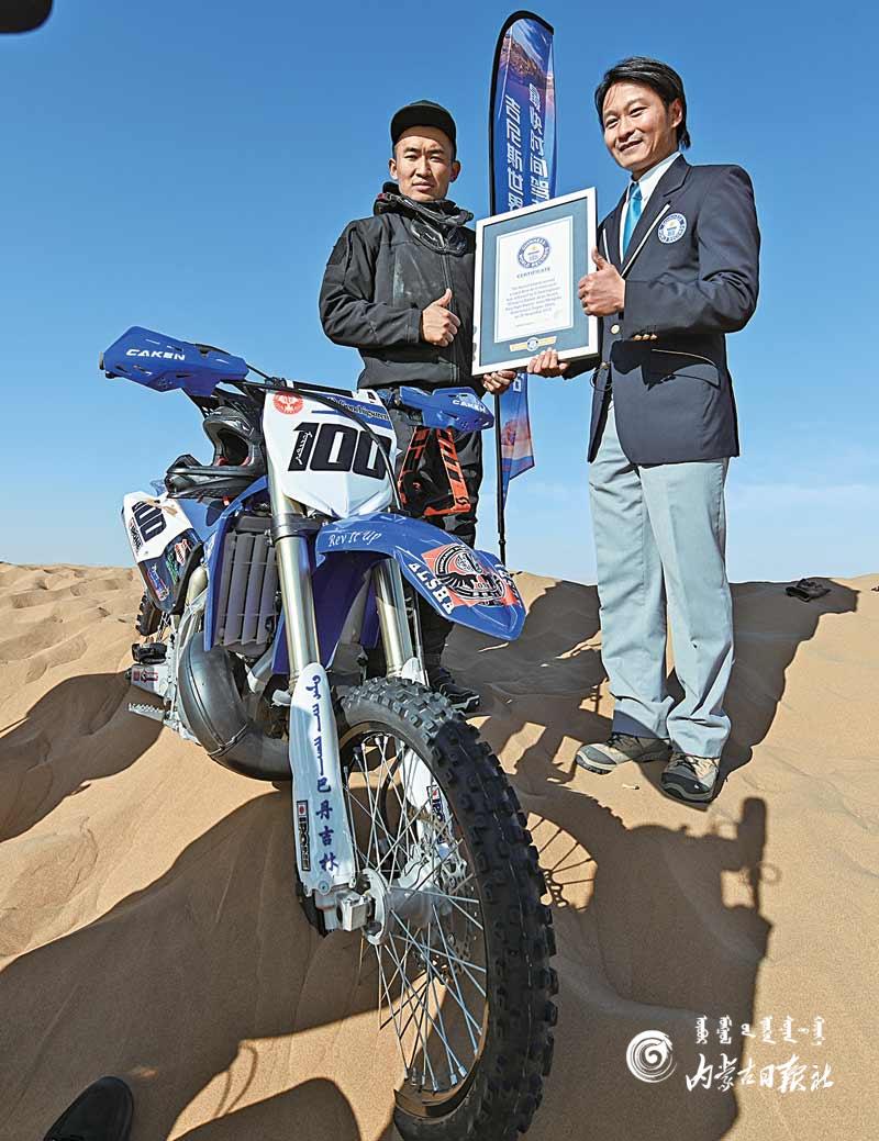 11月26日,经吉尼斯世界纪录认证官杨绍鹏现场确认,蒙古族小伙儿关其格苏荣创造了一项新的世界纪录,他成为世界上驾驶摩托车用时最短登顶“沙漠珠峰”必鲁图沙峰第一人。