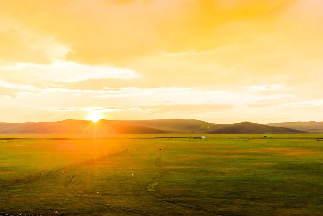 夕阳西下,一望无垠的天际被瑰丽奇姿的火烧云铺满,整个草原好似被红云包裹。