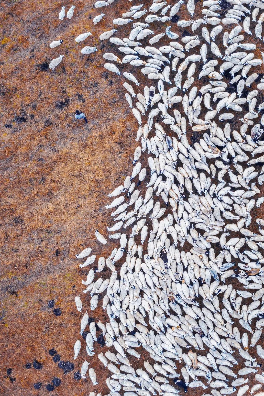 ▲呼伦贝尔草原上的牧民和羊群,图片来源@VCG
