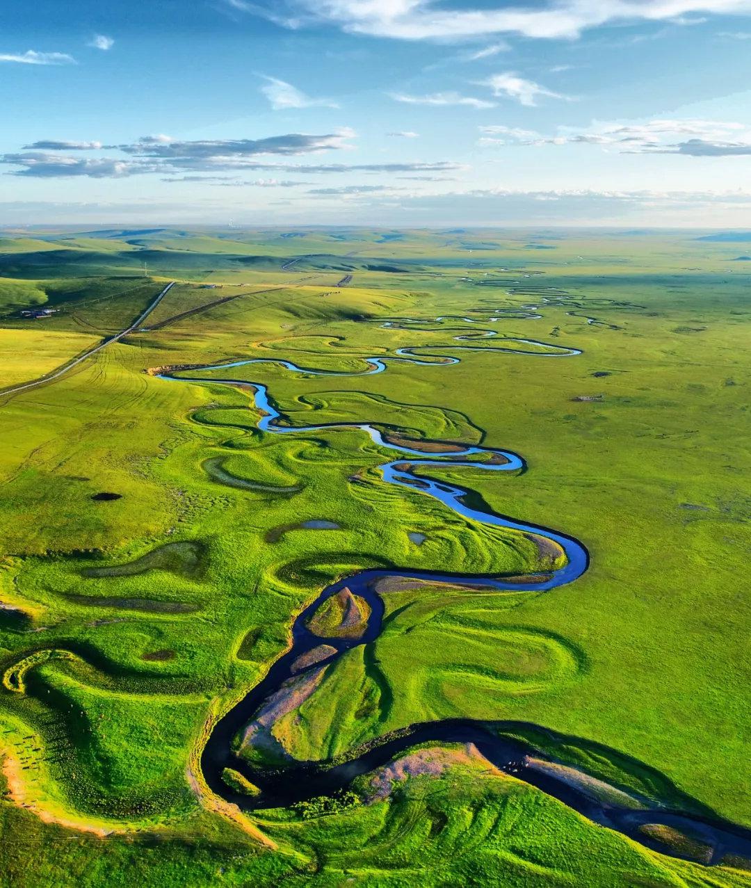 在内蒙古所有草原中,声名最为显赫的莫过于呼伦贝尔草原,这里也是内蒙古草原中降水最为丰沛的地区,于是发源于周边山脉的河流不断向低洼的草原上汇聚,一路蜿蜒盘桓如同大地上散落的绸带。