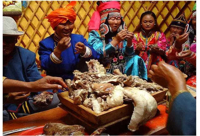 蒙古族的传统饮食大致有四类,即面食、肉食、奶食、茶食。通常,蒙古族称肉食为“红食”,蒙语叫“乌兰伊德”;称奶食为“白食”,蒙语叫“查干伊德”(纯洁、吉祥、崇高之意)。而农区多以谷物蔬菜为主食,以肉食为辅。