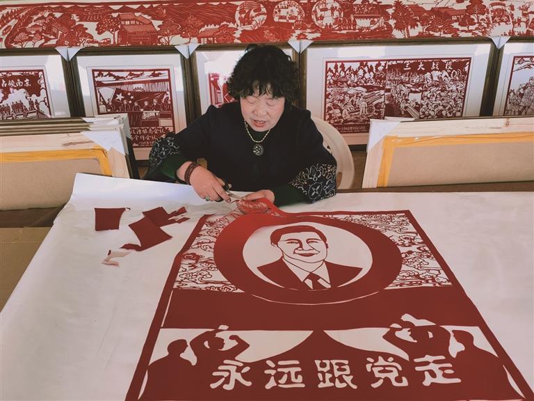 “这个春节特殊,今年是中国共产党成立100周年。我们现在的幸福日子都是共产党带着大家干出来的,这些感党恩的年画贴在家里,映衬了红红火火的日子,更寓意着听党话、跟党走。”赵美玲说,一双指头裹着胶布的手在红纸上辗转、腾挪、跳跃,一幅关于“中国梦”的剪纸年画雏形已现。