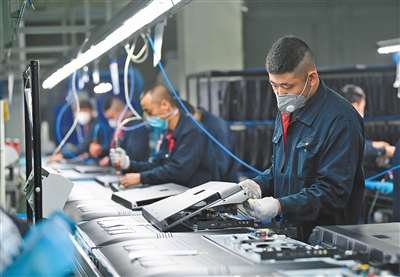 内蒙古TCL光电科技有限公司员工正在生产线上组装电视机。