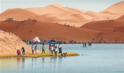 杭锦后旗乌兰布和沙海湖景区内游客们正在享受假期生活。韩哈斯摄